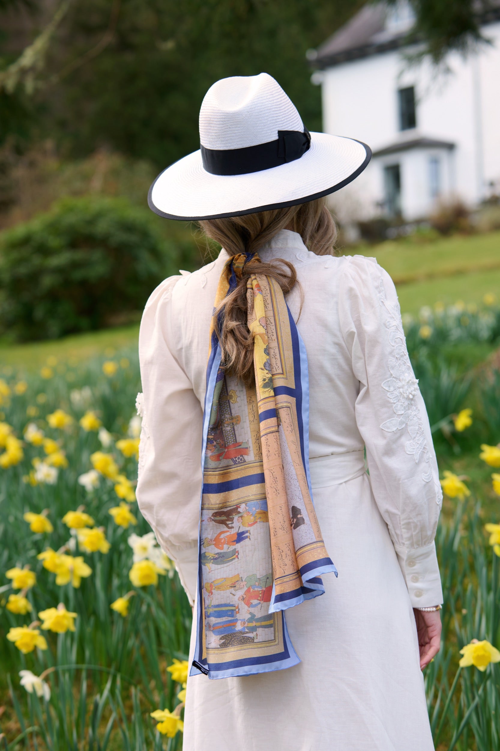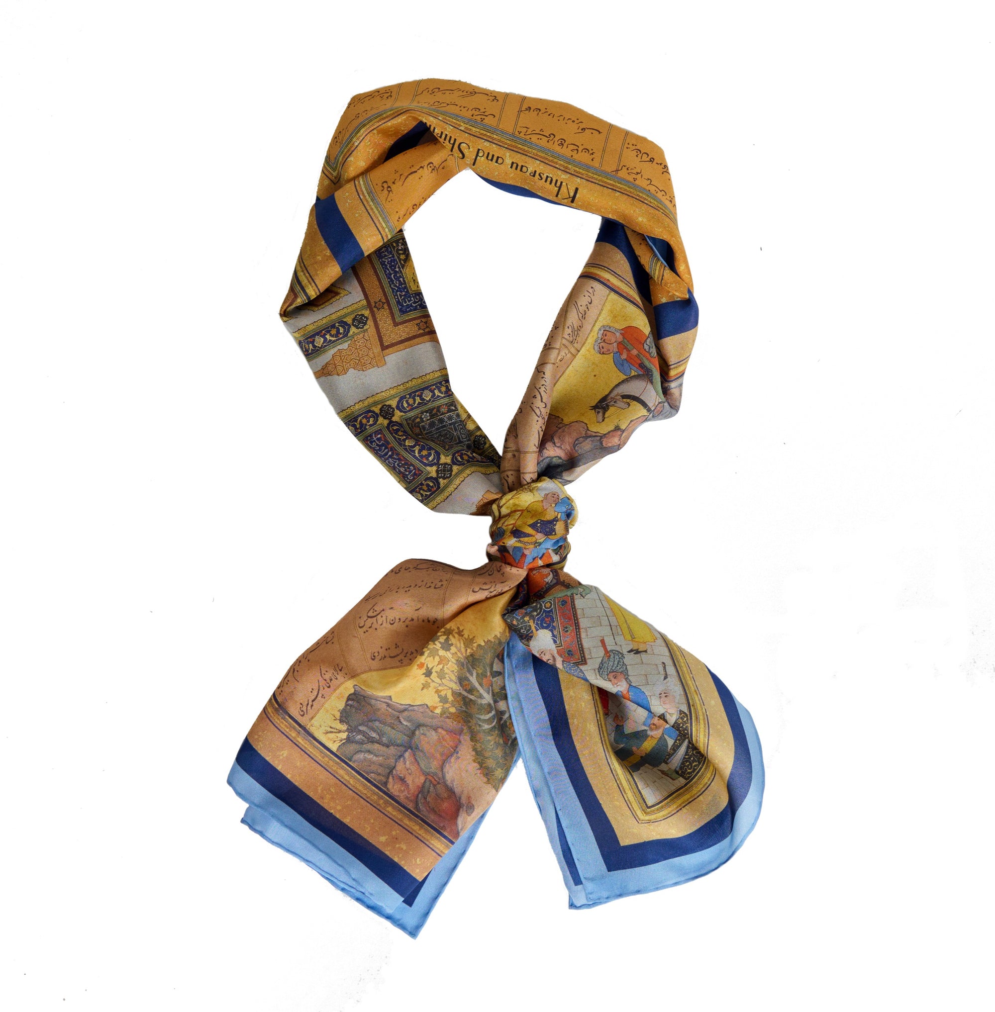 This scarf tells the story of Khusrau and Shirin, written by the 12th Century poet Nizami. Paintings by the 16th Century artist Shaikh Zada show (from the left) Khusrau espies Shirin bathing in a pool, and falls in love with her; then Shirin meets with the sculptor Farhad, who also loves her; the text narrates the story; then Khusrau and Shirin are betrothed (Farhad dies of a broken heart); and finally Khusrau is King. The original artwork is now with the Metropolitan Museum of Art, New York City.
