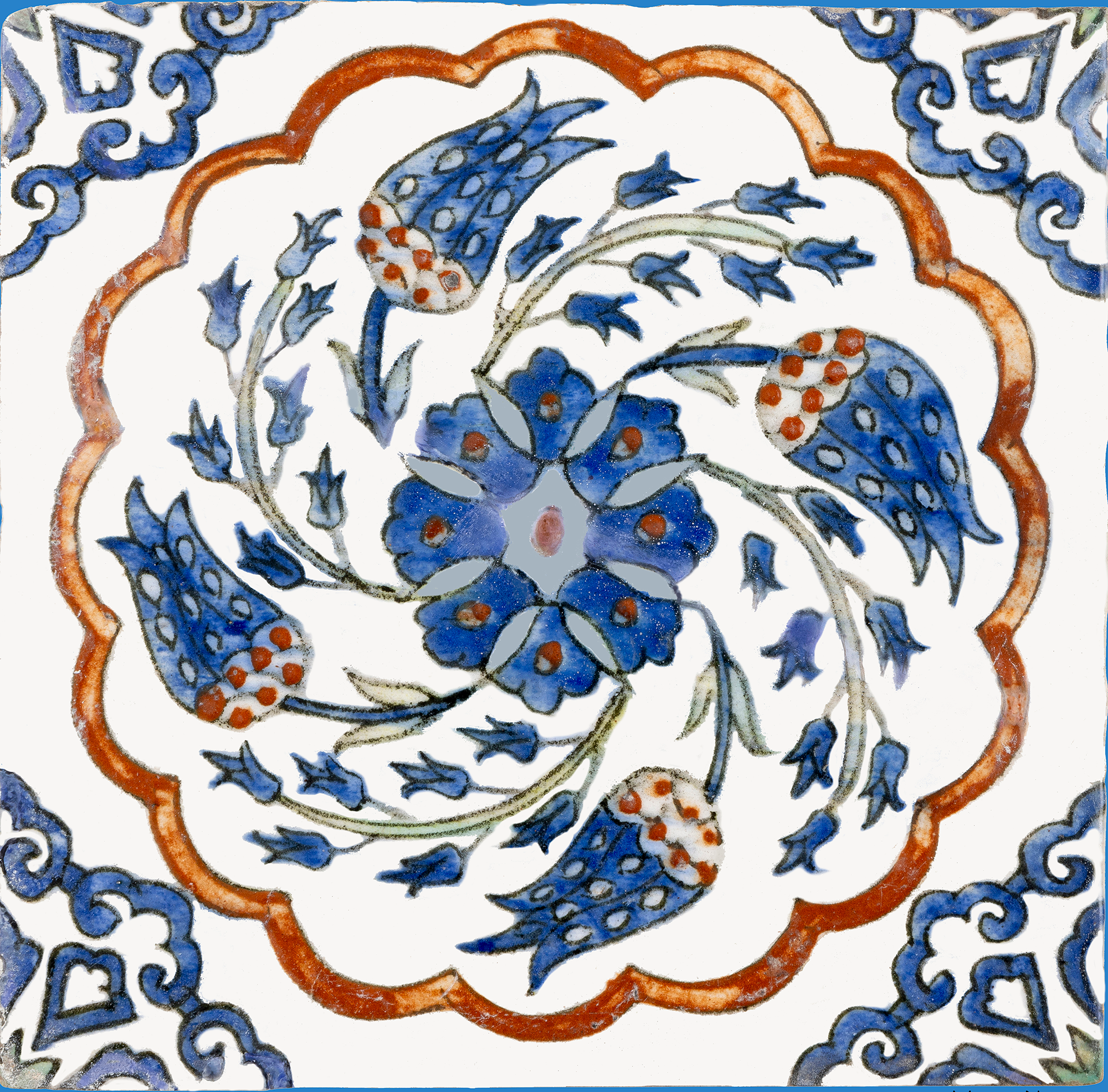 This design is from a pottery tile of the Safavid era, believed to date from the 17th Century. The tile was made with Stoneware: pottery where ground glass (frit) is added to clay to reduce its fusion temperature. Fritware was invented in the Medieval Islamic world to give a strong white body. Combined with tin-glazing the surface it could emulate the qualities of Chinese porcelain. The tile (one of a pair) is now part of the Bennett-Farahbod Collection of Persian Art.