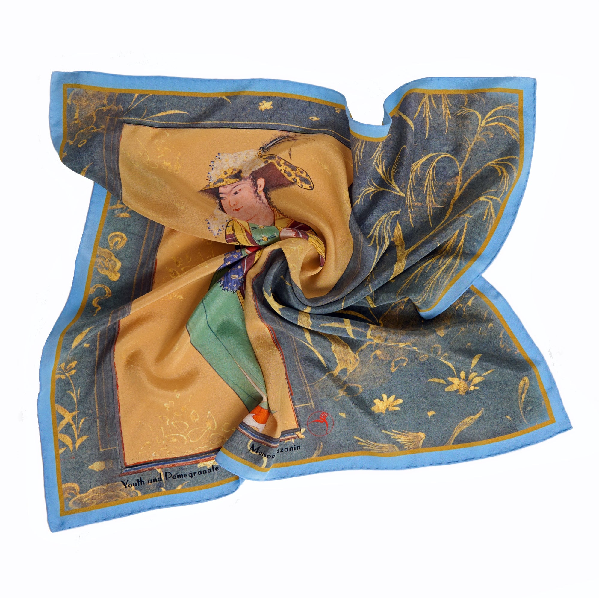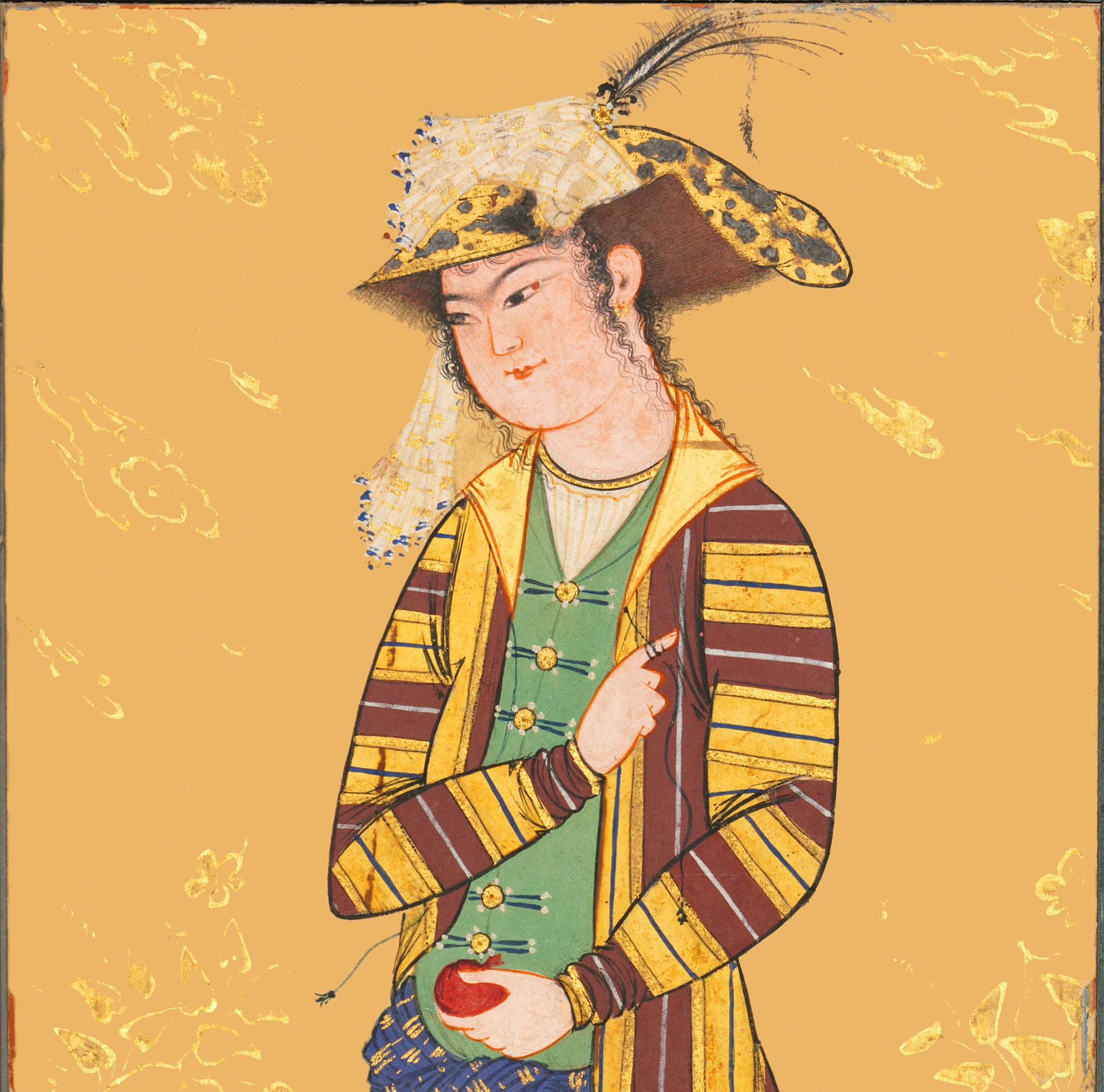 This painting, of a youth holding a pomegranate, reflects the style of the early 17th Century artist, Riza-yi ‘Abbasi. He was the most gifted painter at the court of Shah ‘Abbas in Isfahan, and his work inspired many adaptations by other artists of the Safavid era. Pomegranates are a common subject in Persian art, and they symbolize fertility, life, and eternal life The painting is now in the collection of Cleveland Museum of Art, Cleveland, Ohio.